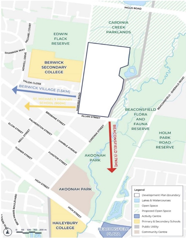The development plan precinct boundary is nestled behind Berwick Secondary College on the corner of Manuka Road and Allen Street, and close to Cardinia Creek Parklands.